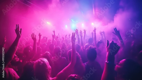 A packed crowd enjoying a concert with a stage filled with pink and blue smoke, creating an energetic atmosphere. Concept: Music, excitement, and unity.
