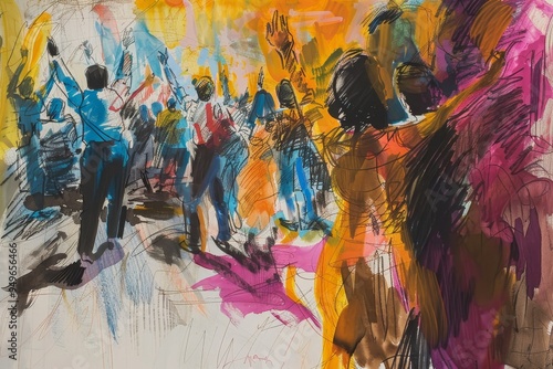 A painting depicting a group of people walking along a busy street, The anticipation and excitement of opening night depicted in a series of dynamic, energetic sketches