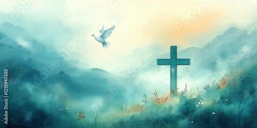painting, cross, bird, flying, mountain, peaceful, serene, faith, mood, freedom, hope, religion, christian, act, god, symbol, spiritual, holy, sky, light, resurrection, church, easter, belief, religious, crucifix, heaven, catholic, bible, praise, sunrise, cloud, spirit, background, silhouette, salvation, jesus christ, risen, concept, jesus christ, worship, sunset, prayer, believe, forgiveness, friday, love, sun, sunlight