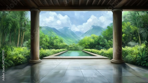 painting, view, top, column, nature, green, colours, outdoors, wood, material, summer, landscape, tree, grass, forest, architecture, indoor, mountain, rural, scene, background, design, no people, modern, flooring, plant, non-urban, blue, cloud, sky, window, day, meadow, domestic, room, environment, beauty, formal, garden, empty, space, leaf, land, lifestyle, freshness, illustration, table