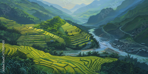 view, landscape, river, rice, terrace, painting, nature, illustration, sky, travel, rural, china, beautiful, style, village, background, green, traditional, architecture, tour tourism, water, terraced, tropical, field, scenic, yellow, exotic, mountain, oil, paint, agriculture, lush, leaping, filter, filtered, generic, gorge, house, canvas, photo, impressionist, vietnam