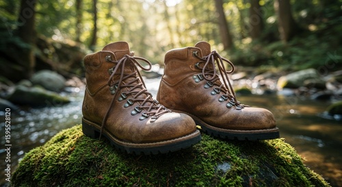 hiking, outdoors, nature, adventure, forest, travel, boot, lifestyle, footwear, trekking, moss, rock, stream, explore, journey, freedom, equipment, shoe, water, green, sunlight, summer, vacation, trail, leather, brown, calm, peaceful, get-away, rustic, walking, worn, recreation, wilderness, scenic, well-being, active, background, closeup, pair, camping, creek, leisure, river, natural light, serene, copy space, still life