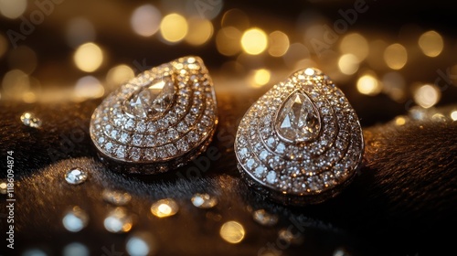 A pair of diamond-studded earrings lying on a velvet surface, their sparkle enhanced by ambient lighting.