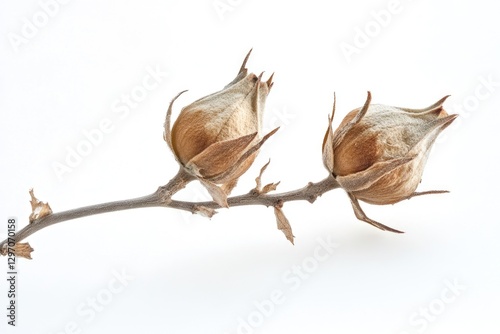 A pair of dried flowers sit atop a branch against a white background, offering a simple yet striking visual