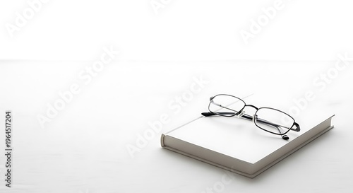 A pair of eyeglasses resting on a closed book against a white background