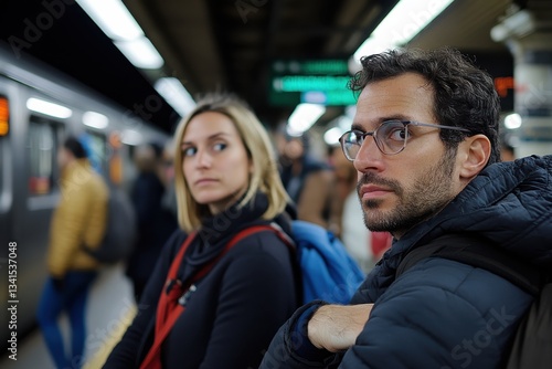 A pair of focused passengers waiting for their train, creating an engaging scene in a subway station that captures anticipation and contemplation in urban life.