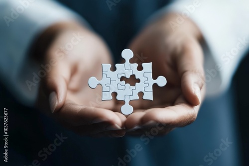 A pair of hands gracefully holding a small completed puzzle illustrating the resolution and unity of different parts coming together, symbolizing problem-solving.
