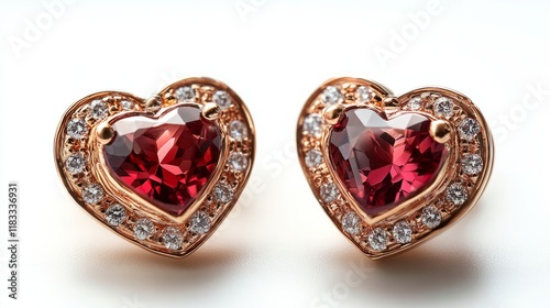 A pair of heart-shaped earrings with a sparkling gem, isolated on white