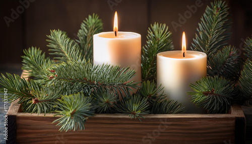 a pair of lit candles nestled in a rustic wooden box adorned with pine branches