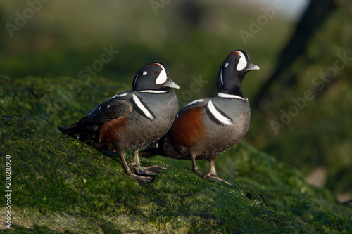 A pair of male Harlequin Ducks perch on a seaweed covered jetty rock in the bright sun.