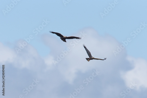 A pair of Marsh Harriers (Circus aeruginosus) in flight, Merja Zerga, Morocco.