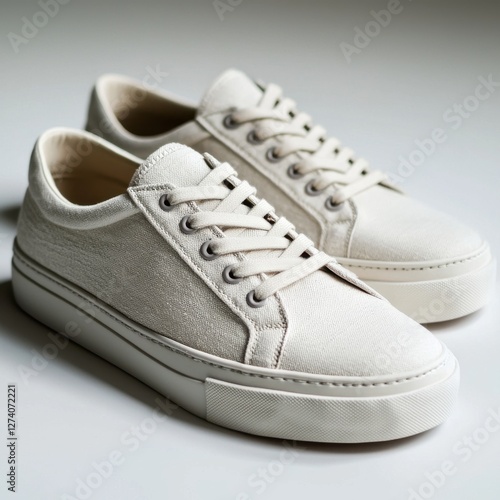A pair of minimalist white canvas sneakers with laces and rubber soles, presented in a clean, contemporary studio setting showcasing simplicity and style, casual wear.