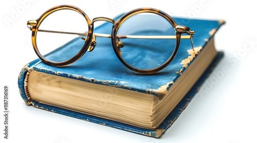 A pair of reading glasses on a book isolated on white background