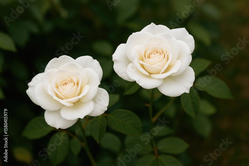 A pair of white rose plants with lush green foliage