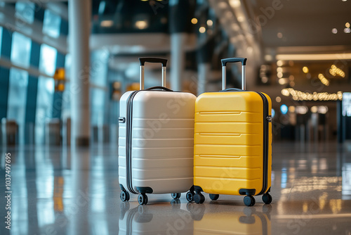 A pair of yellow and white suitcases is placed on the airport floor, with gray walls in the background.