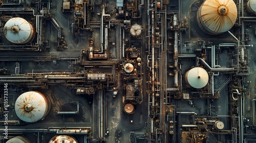 A panoramic aerial shot of an enormous petrochemical facility, revealing a maze of pipelines and clusters of towering tanks.