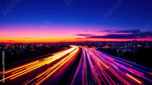 A panoramic shot of a city skyline during rush hour, capturing the intricate patterns of vehicles on the roads below, illustrating the vibrant city life.