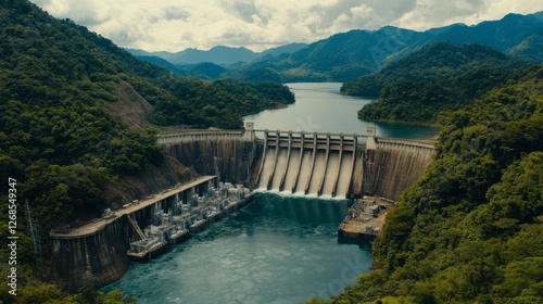 A panoramic shot of a hydroelectric dam, highlighting its massive structure, with water flowing powerfully from the turbines and lush vegetation surrounding it