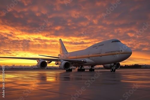 A panoramic shot reveals a sparkling white passenger jet on the airport runway, glowing in the warm colors of a summer sunset, evoking a sense of calm.