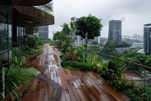 A panoramic urban rooftop garden filled with lush vegetation, offering expansive city views and a wooden deck amidst towering modern buildings under a cloudy sky.