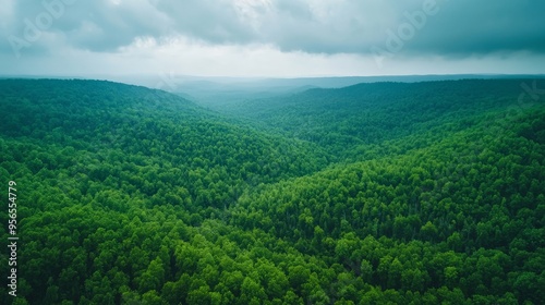 A panoramic view of a green forest from above, expansive and majestic