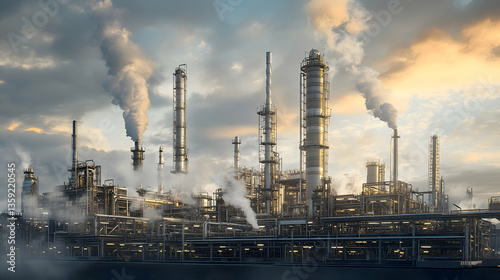 A panoramic view of a high-tech chemical factory, with towering distillation columns and steam rising from processing units