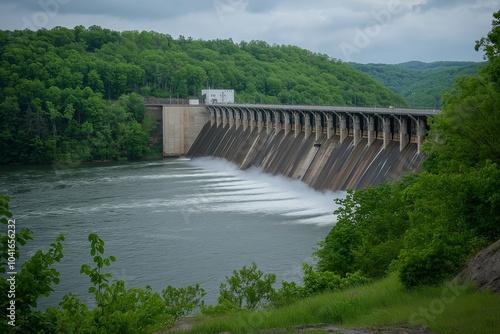 A Panoramic View of a Large-scale Hydroelectric Dam, Emphasizing the Power of Water as a Renewable Energy Source Amidst Lush Green Surroundings