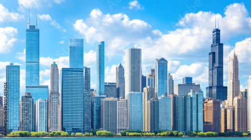 A panoramic view of a modern cityscape with skyscrapers against a bright blue sky with white clouds.