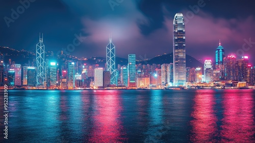 A panoramic view of Hong Kong's Victoria Harbor at night. No people, cityscape with copy space.
