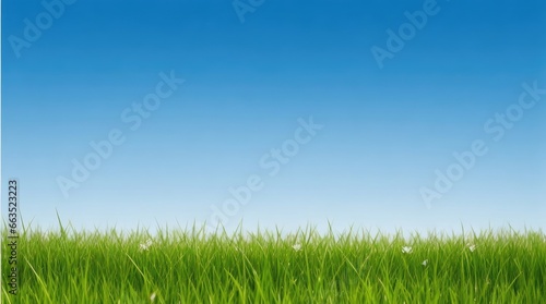 A Panoramic View of Lush Green Grass Beneath a Clear Blue Sky, Capturing the Essence of Refreshing Spring Nature.