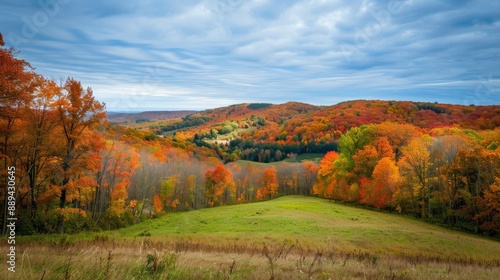 A panoramic view of rolling hills covered in vibrant autumn foliage, with a clear, crisp sky overhead