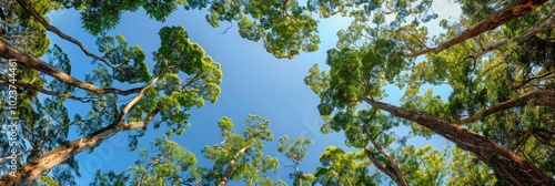 A panoramic view of the canopy from below, showcasing tall trees with lush green leaves that form an intricate pattern against a clear blue sky