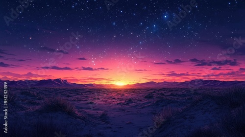 A panoramic view of the desert under a twilight sky, with the colors of the sunset fading and the first stars beginning to appear.