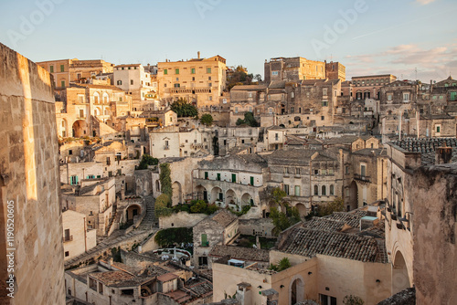 A panoramic view of the historical world heritage city of Matera, Puglia, Italy, la città dei sassi, with its cave houses