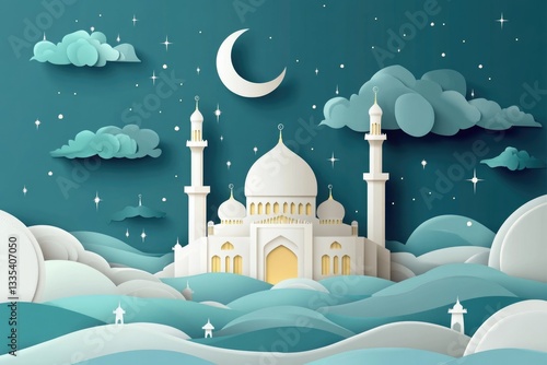A paper cut of a mosque illuminated by moonlight at night