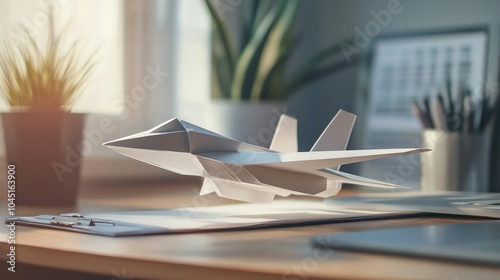 A paper transforming into a sleek jet airplane on a desk, illustrating the power of creativity and growth in achieving business success
