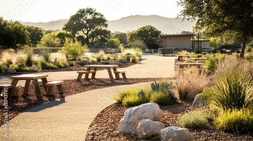path, park, landscape, light, visible, serene, concrete, variety, plant, rock, natural, atmosphere, wooden, picnic, table, visitor, meal, tranquil, surrounding, background, building, brown, beige, exterior, pavilion, shelter, mountain, distance, scene, warm, gold, sun, peaceful, ambience, picnic table, light brown, golden light
