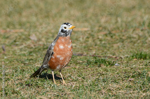 A partially albino American Robin (leucistic) hops on the lawn in the February sunshine