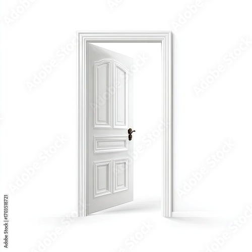door, white, interior, open, panel, raised, hardware, simple, shadow, background, frame, entrance, exit, passage, way, access, threshold, home, house, room, building, interior design, architecture, design, style, classic, traditional, elegant, clean, minimalist, modern, contemporary, bright, light, wood, wood grain, painted, ajar, open door, entranceway, hallway, space, perspective, realistic, image, illustration, graphic, visual
