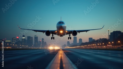 A passenger jet approaching for landing at an airport during twilight, with illuminated city skyline behind. Travel, aviation industry, and flight concept.