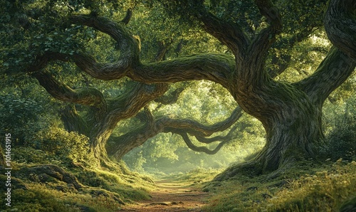 forest, tree, nature, green, timberland, foliage, branch, moss, sunlight, pathway, path, wood, old, tree trunk, gnarled, canopy, summer, lush, overgrown, magical, mystical, enchanted, fairy tale, beauty, serenity, calmness, peaceful, tranquil, harmony, life