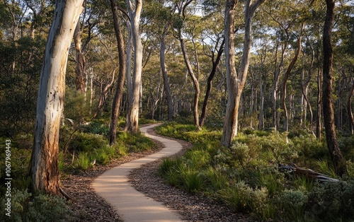 A path winding through a forest of native trees, each tree supporting the surrounding ecosystem