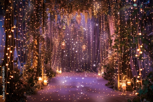 A pathway illuminated by fairy lights and lanterns, creating a magical and enchanting atmosphere, A magical and enchanted backdrop with fairy lights and glittering accents