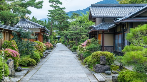 A pathway lined with blooming Japanese needle flowers in a serene garden.