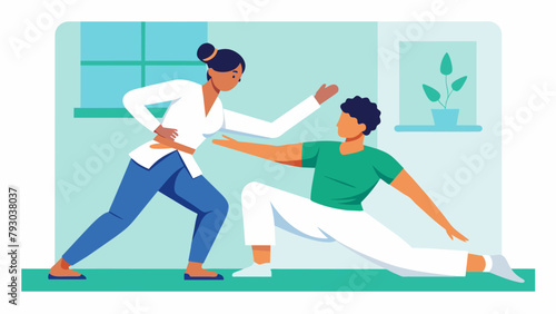 A patient with a broken arm working with a physical the to perform a series of martial artsinspired stretches and exercises.