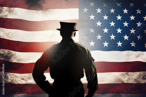 A patriotic man standing proudly in front of the iconic American flag, Silhouette of a man saluting against the backdrop of the American flag, AI Generated