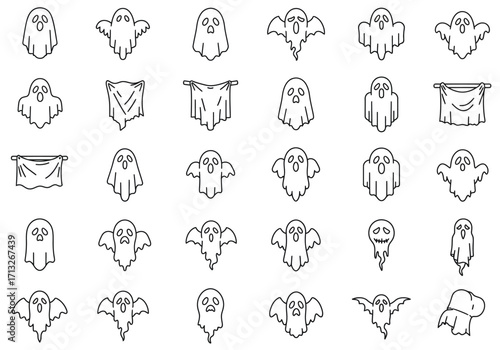A pattern of 49 handdrawn ghost illustrations in black outline on a white background