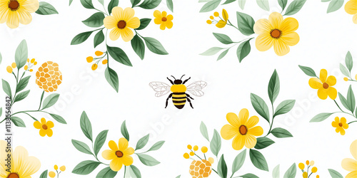 flower, yellow, bee, white, background, floral, pattern, cheerful, bright, summer, spring, vibrant, natural, concept, decoration, nature, happy, design, copy space, texture, blooming, high-coloured, clean, sunny, lively, joyful, elegant, detailed, fresh, harmony, botanical, bee, artistic, arrangement, floral pattern, green, garden, warmth, soft, graphic, decorative, seamless, peaceful