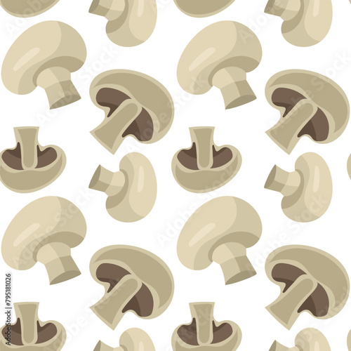 A pattern of mushrooms of champignons whole and in section, demonstrating the different sizes and orientation of mushrooms in a repetitive design. Use for packaging to show the taste. Seamless texture