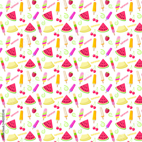 A pattern of pieces of watermelon and melon and ice cream, cherry, raspberry